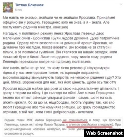 «Із Дніпропетровщини звернулась дружина Левенця. Розповіла, що йому дуже довго ставили палки в колеса, що він активіст, націоналіст у такому східному містечку. Тренер бойового гопака. Він сам за фахом вчитель фізкультури, відкрив там цю секцію. Вона казала, вчепились до нього, навішавши, звинувативши в економічних злочинах», – розповідає Близнюк.