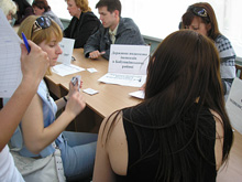 Інженер однієї з енергопостачальних компаній Галина Сапранкова прийшла на ярмарок із чітким завданням від дирекції – знайти десяток молодих людей на вакансії електромонтерів, слюсарів та ремонтників. Середня зарплата – півтори тисячі гривень плюс соціальні гарантії. Досвід роботи не потрібен. Але підшукати людей, які б підходили для цієї роботи, важко: до претендентів суворі вимоги.