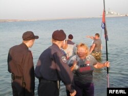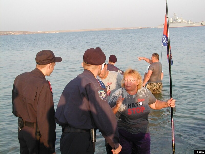 Ще перед висадкою десанту кілька особливо активних бабусь із прапорами ПСПУ по груди увійшли у воду, щоб обійти міліцейський кордон. А коли правоохоронці, щоб ті не потрапили під колеса бронетранспортерів, кинулися їх рятувати, то почали битися древками прапорів і кидатися камінням. Перемогла молодість, а бабусі пішли на берег сушитися.