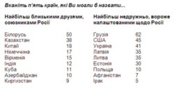 Чолівка списку країн, що їх пересічні росіяни вважають своїми найліпшими друзями і найбільшими ворогами, варта того, щоб її навести повністю.