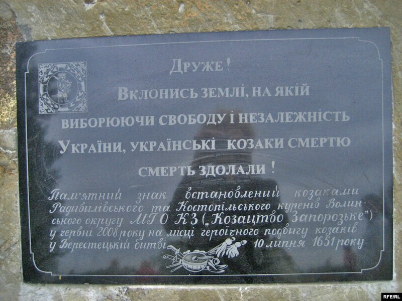 На місці загибелі трьохсот козаків, оспіваному у народній пісні та описаному в монографії француза П’єра Шевальє, саме в ці дні постав пам’ятний знак, виготовлений на замовлення волинських козаків у Луцьку.