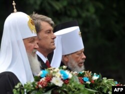 Президент України Віктор Ющенко (у центрі), Патріарх Московський і Всія Руси Кирило (ліворуч) і митрополит Київський Володимир під час покладання квітів до меморіалу жертвам Голодомору у Києві