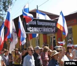 Тим часом активісти прокремлівських організацій, яких на акцію проти української незалежності зібралося не дуже багато (за даними міліції, 500-600 осіб, за даними організаторів – півтори тисячі) пройшли центральними вулицями Сімферополя і провели мітинг біля Постійного представництва Президента України в Криму. Вони спробували передати до приміщення Представництва український прапор з великою чорною стрічкою, але установа виявилася зачиненою.