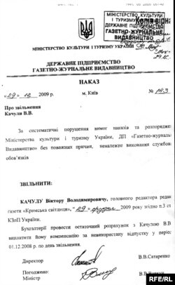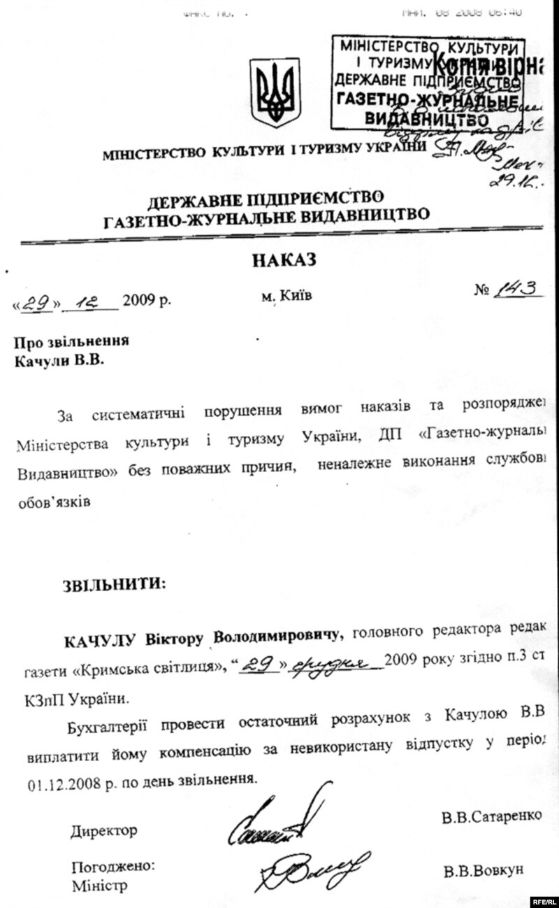 У наказі, підписаному директором Державного журнально-газетного видавництва Віталієм Сатаренком і завізованому міністром культури і туризму України Василем Вовкуном, причиною звільнення Віктора Качули названі «систематичні порушення вимог наказів та розпоряджень Міністерства культури і туризму України і Державного журнально-газетного видавництва без поважних причин і неналежне виконання службових обов’язків».