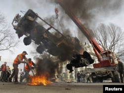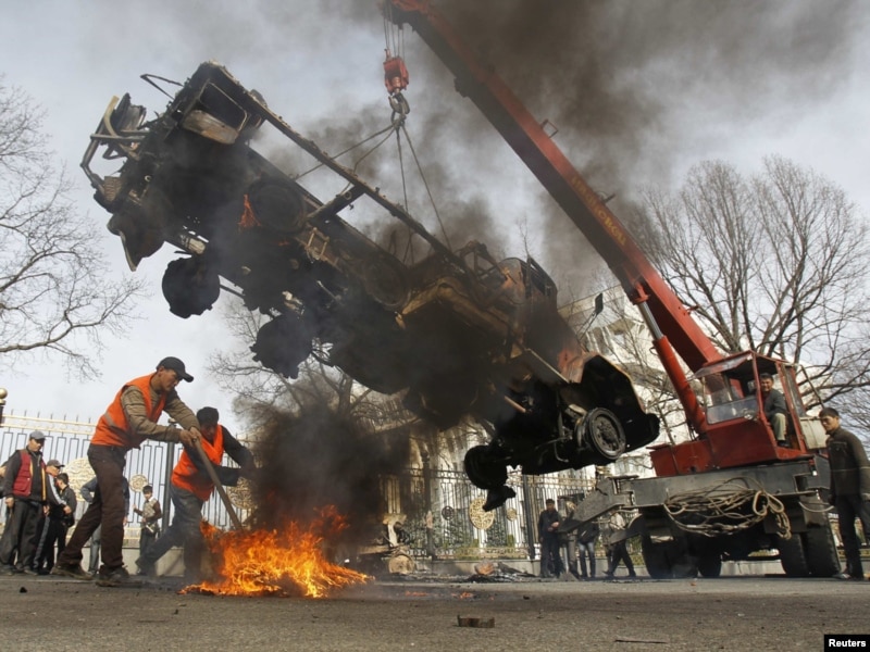 Із центру Бішкека забирають залишки вантажівки, що була спалена під час заворушень у Киргизстані в середу