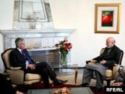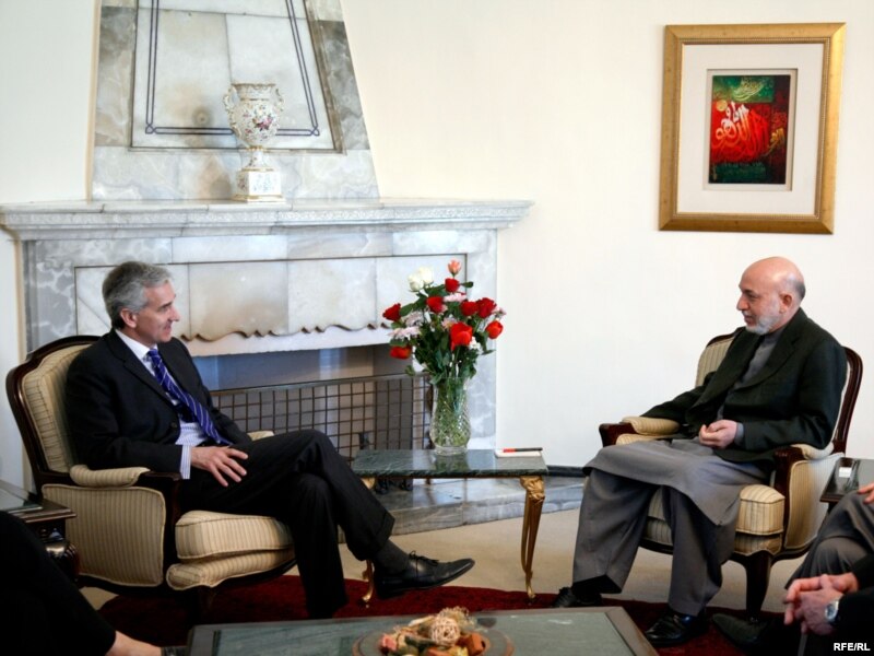 Президент Радіо Вільна Європа/Радіо Свобода Джефрі Ґедмін (зліва) і президент Афганістану Хамід Карзай. Кабул, 6 квітня 2010 року