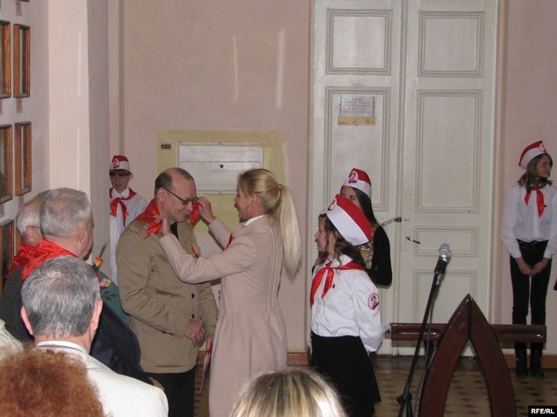 Присутні тут же юні ленінці прийняли до своїх лав з пов’язуванням червоних галстуків і присвоєнням звань «почесний піонер» і Грача, і Мальгіна, і колекціонера Матвієнка.