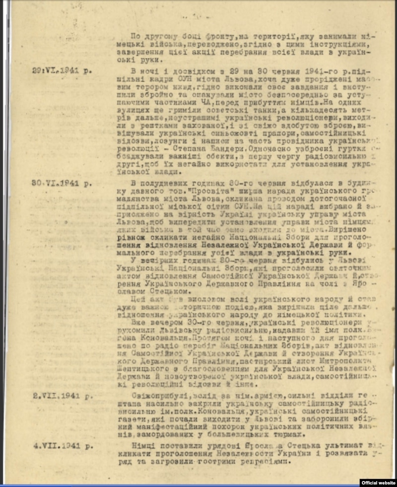 «Я нещодавно знайшов цікавий оунівський документ про те, які настрої панували на той час у місті, це щось подібне до аналітичної записки, – розповідає він. – Йдеться про те, що німці намагаються використати оунівців у власних інтересах, налаштувавши їх проти євреїв. Так от, там звучить заклик на такі провокації не піддаватись».