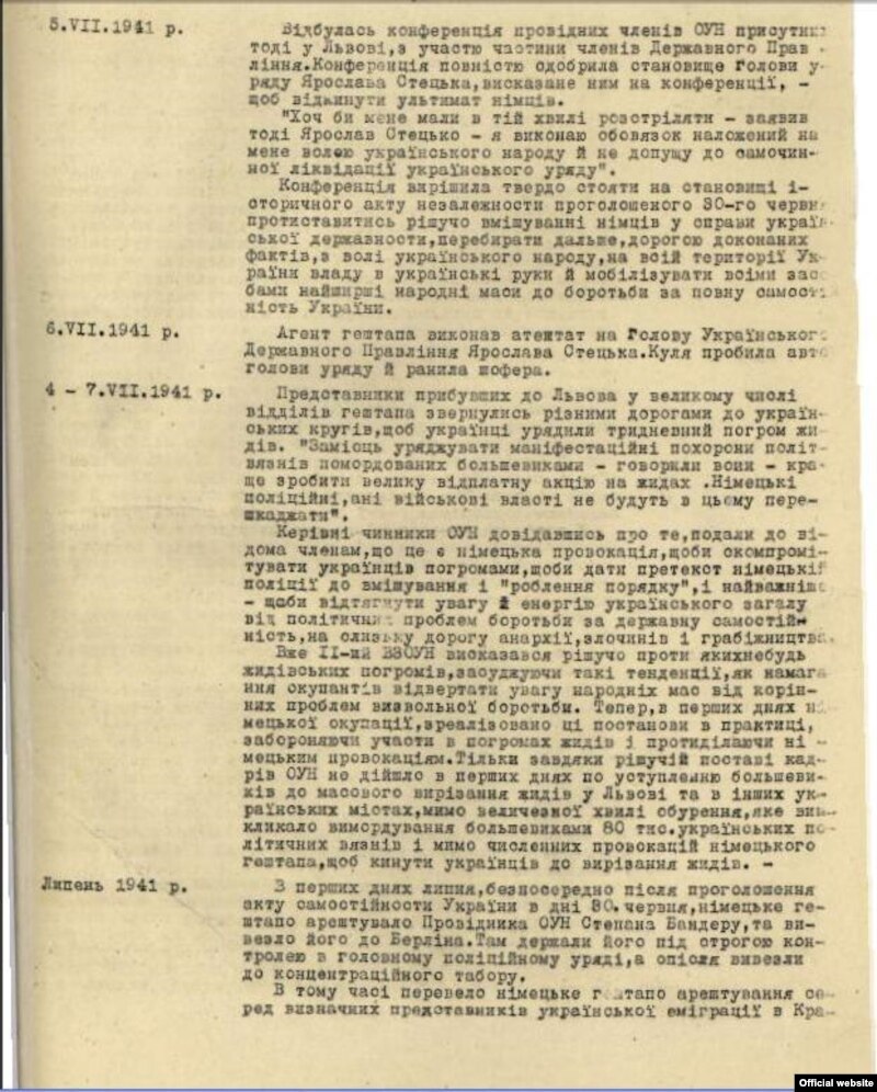 При цьому також висловлюється теза про відповідальність самого Степана Бандери за їхню організацію.