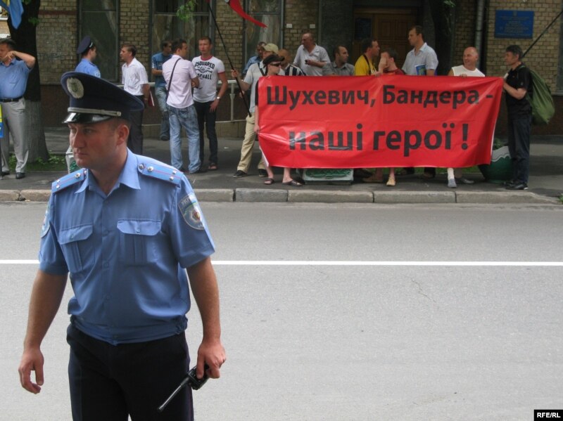 Перед центральним входом до Вищого адміністративного суду в Києві зібралося близько ста осіб із прапорами політичних об’єднань правого спрямування та із плакатами: «Героям УПА – слава!», «Українцям – сильна держава!», «Тільки влада ідіотів судить справжніх патріотів».