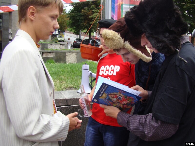 По один бік – молодики у куфайках, шапках-вушанках та з пляшками горілки в кишенях, по другий – юнаки у костюмах із книжками в руках. Такою в уяві організаторів постають Україна радянська та Україна європейська.