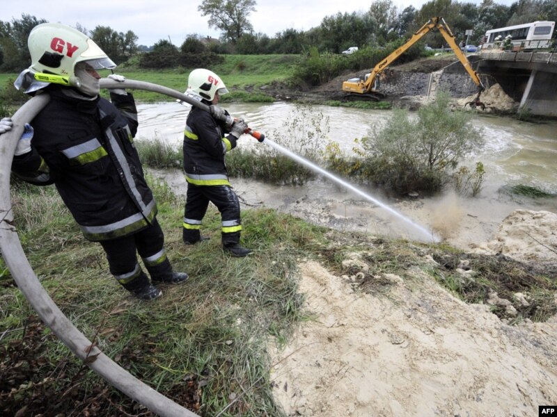 У гирлах річок Марцал і Раба, які є притоками Дунаю на північному заході Угорщині, з річкових катерів аварійні служби ділодобово сиплють у воду гіпсовий порошок у великих кількостях а також намагаються знешкодити токсичні речовини соляною кислотою.