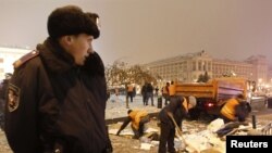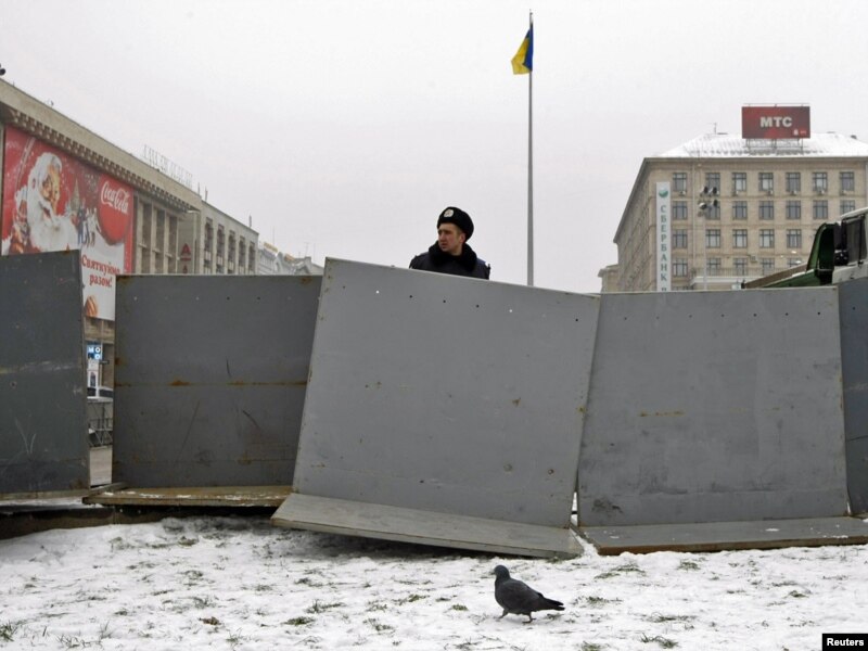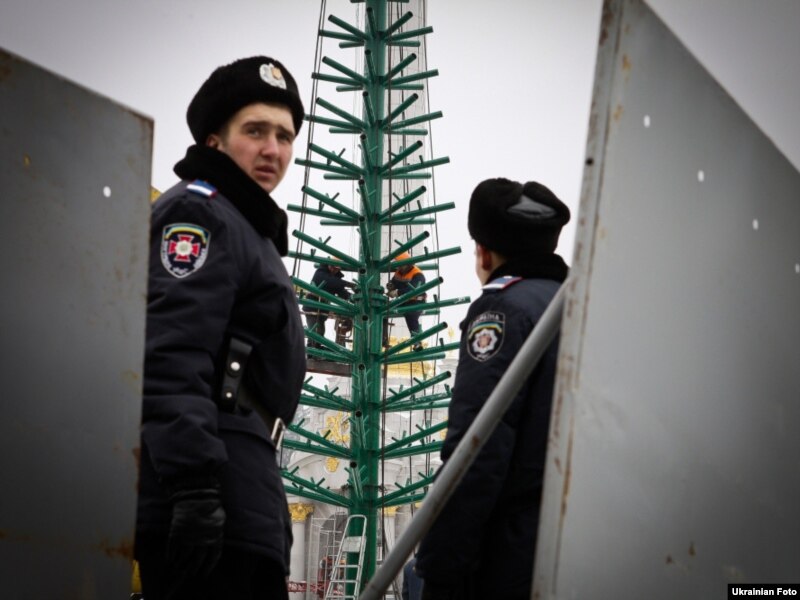 Опів на п’яту ранку п’ятниці працівники столичних комунальних служб за сприяння кількасот бійців підрозділів МВС демонтували наметове містечко протестувальників. Після демонтажу наметів, під охороною міліцейських кордонів, комунальники почали встановлювати новорічну ялинку.