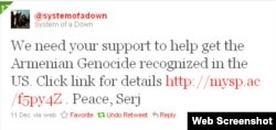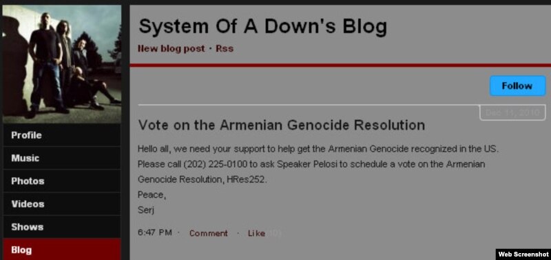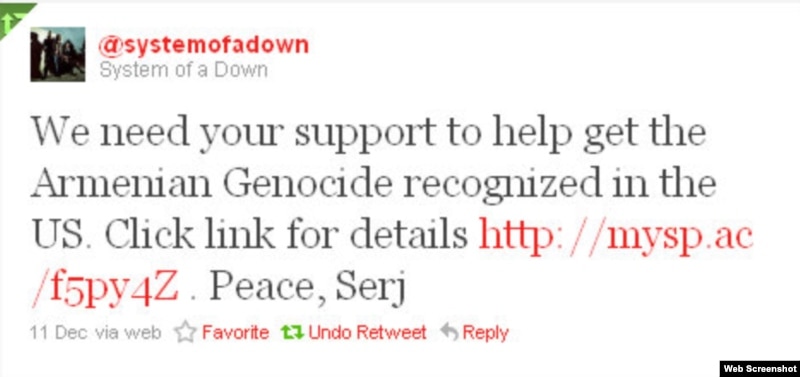 Раніше музиканти неодноразово організовували маніфестації та благодійні концерти на підтримку визнання геноциду вірменів. Але цього разу гурт використав ще й найновіші досягнення сфери комунікації і у мережі запропонував своїм шанувальникам посприяти визнанню геноциду вірменів. Як наслідок, майже 5,4 мільйони фанатів «Системи» прочитали на власних стінах у Facebook прохання зателефонувати за вказаним номером гарячої лінії і віддати свій голос за визнання геноциду Сполученими Штатами. Крім того аналогічну інформацію музиканти поширили серед майже мільйона фанатів на MySpace та Twitter. При чому фанатів S.O.A.D.не закликали голосувати наосліп. Багато із них чудово знайомі з подіями 1915 року у Вірменії, оскільки трагедії вірменського народу присвячені тексти багатьох пісень гурту.