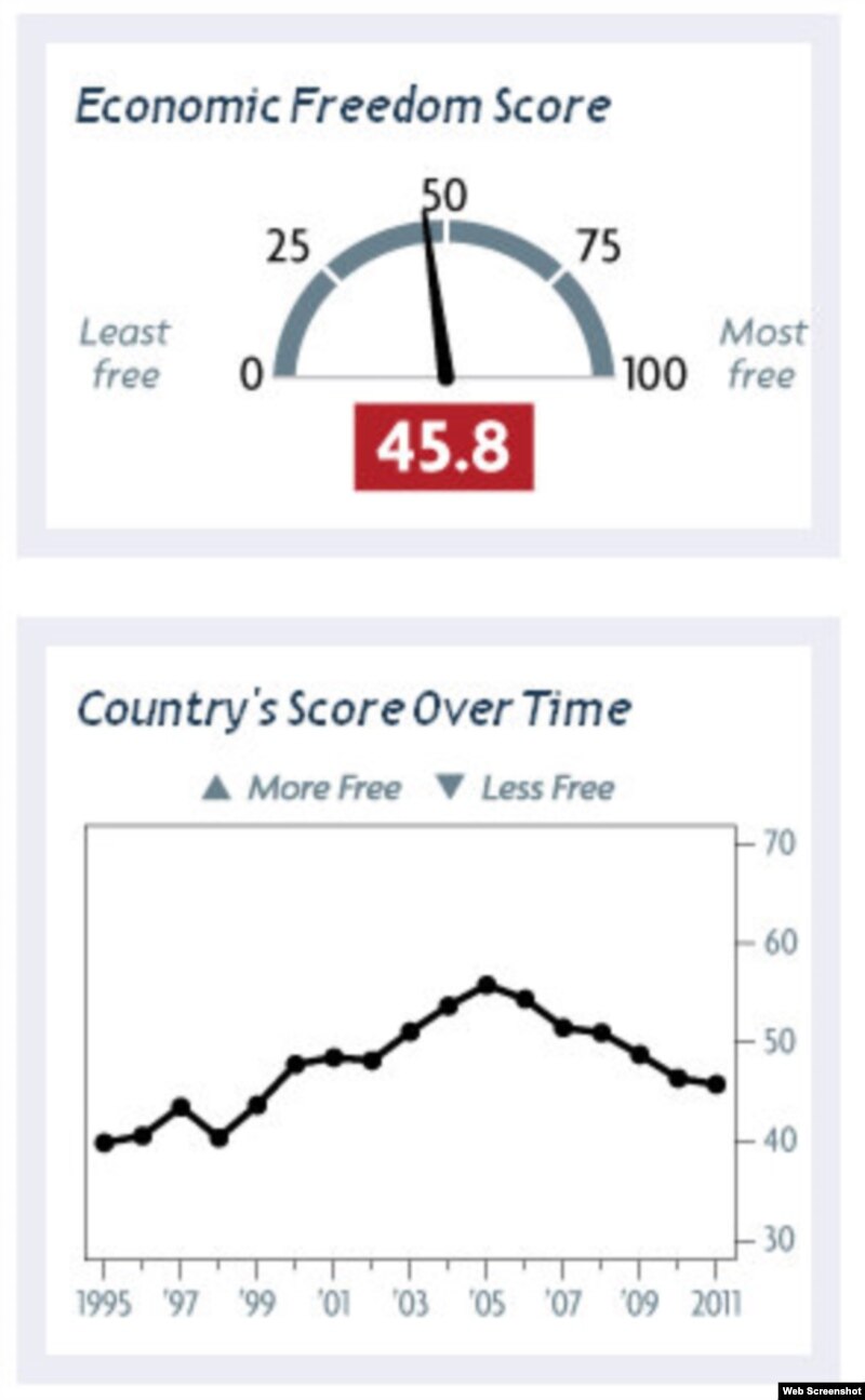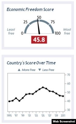 З огляду на ці показники, Україні процвітання найближчим часом не загрожує, стверджує аналітик Heritage Foundation та один із редакторів цьогорічного індексу, Джеймс Робертс. «Українські показники погіршуються з 2006 року, – каже він. – Найвищий показник Україна мала у 2005 році, і від того часу він упав на цілих 10 пунктів – до 45,8. Падіння складало 20%, що перевело Україну до категорії, яку ми визначаємо як «репресивну». До цієї категорії входять більшість африканських країн, а з колишнього Радянського Союзу, крім України, Білорусь, Узбекистан та Туркменистан.