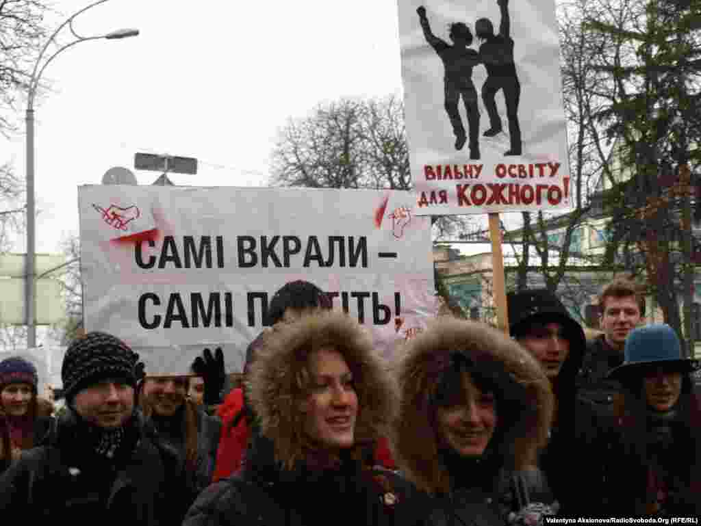 Студенти, зокрема, протестують проти планованого скорочення держзамовлення. У листівках, які роздають охочим, йдеться, що в разі ухвалення оновленого закону чесний вступ до вишів стане неможливим