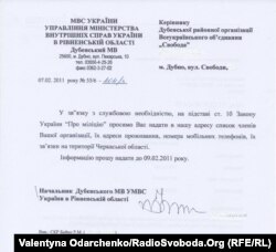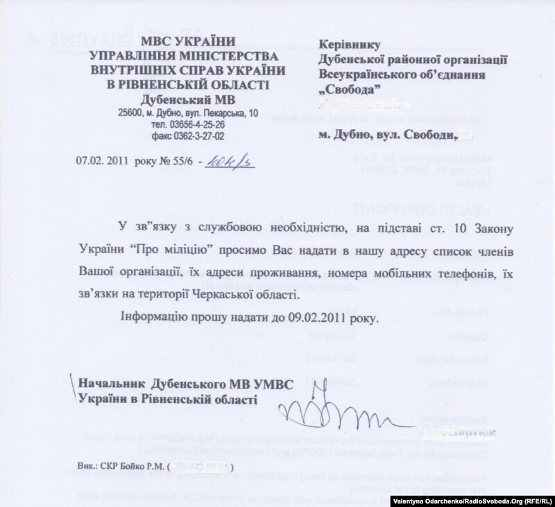 Тим часом голова Дубенської міської організації ВО «Свобода» Богдан Галета оприлюднив фотокопію листа за підписом начальника Дубенського МВ УМВС України в Рівненській області, який містить вимогу надати конфіденційну інформацію про членів організації ВО «Свобода», їхні адреси та зв'язки з «тризубівцями» Черкащини. За його словами, подібні вимоги надійшли також до приймалень Рівненської обласної та Дубенської міської рад. «Свободівці» наголошують, що за період існування у Дубні своєї організації надали правоохоронцям чимало цінної інформації, однак міліція жодного разу так оперативно не реагувала на факти економічних злочинів та порушень екологічного законодавства.