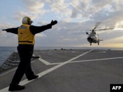 Рятувальний вертоліт ВМС Франції з авіаносця Charles de Gaulle здійснює тренувальну посадку на корабель США Mount Whitney в рамках міжнародної операції. Фото ВМС США