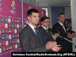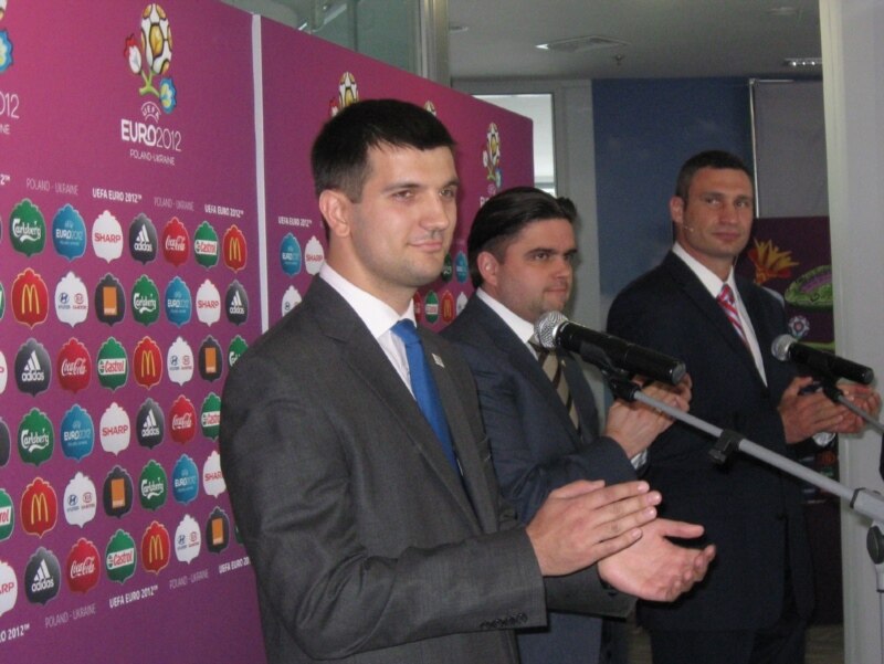 Презентація волонтерської програми УЄФА Євро-2012, Київ, 12 травня 2011 року. На фото зображені (зліва направо) директор Волонтерської програми Андрій Бенцар; директор турніру Євро-2012 в Україні Маркіян Лубківський та Посол УЄФА Віталій Кличко