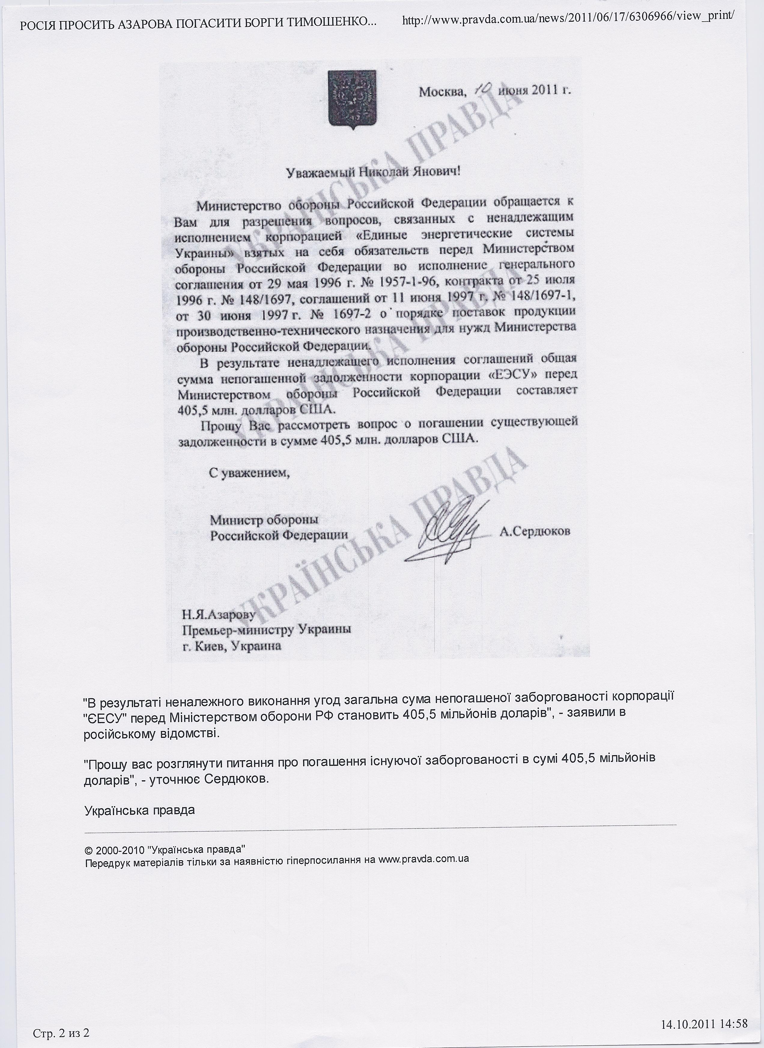 Тут цікава ситуація складається. Коли слухалася справа Тимошенко, то 10 червня 2011 року міністр оборони Російської Федерації Сердюков направив лист Азарову чомусь, в якому він просив «розглянути питання про погашення існуючої заборгованості у сумі 405,5 мільйонів доларів за борги ЄЕСУ».