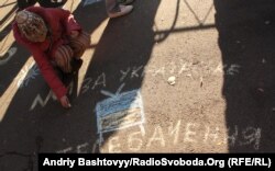 Під час акції на асфальті біля президентської Адміністрації діти крейдою малювали національну символіку, закликаючи Президента захистити українську мову.