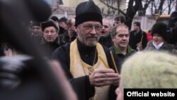Після півторагодинного скандування, до людей підійшли священнослужителі. Протоієрей храму Івана Богослова УПЦ КП Віктор (Маринчак) правив молебен за «ув’язнену рабу Божу Юлію».