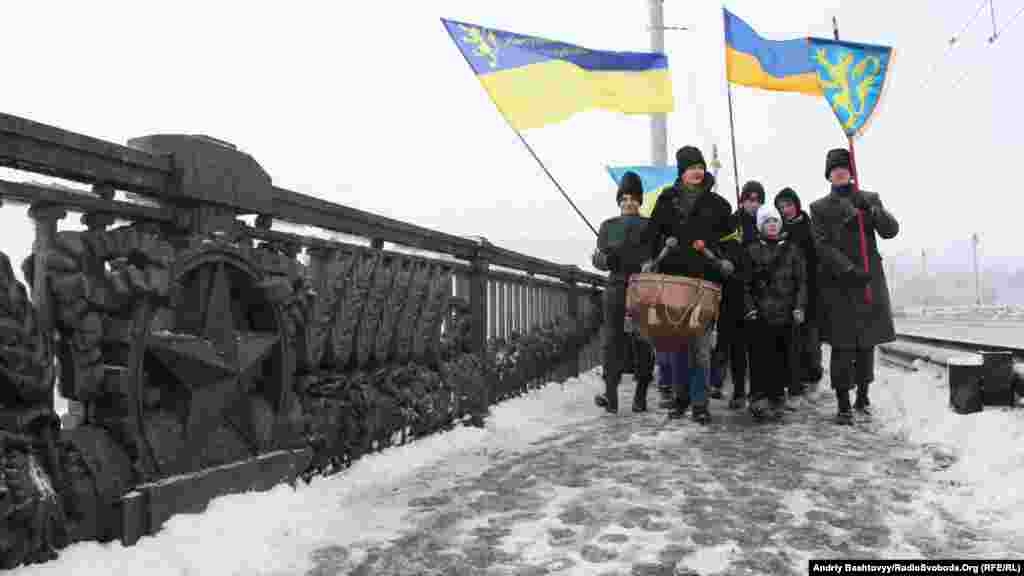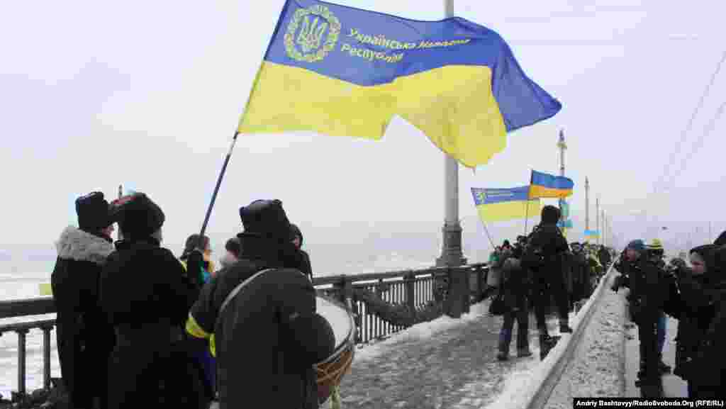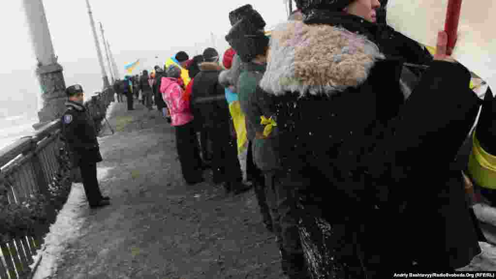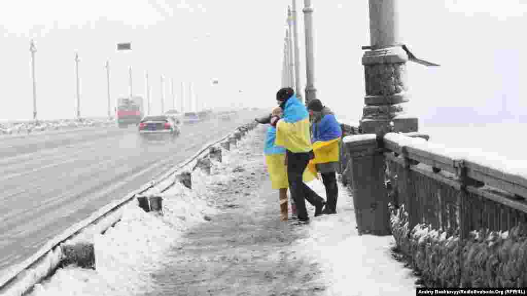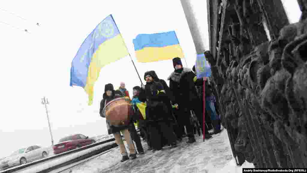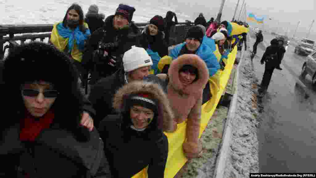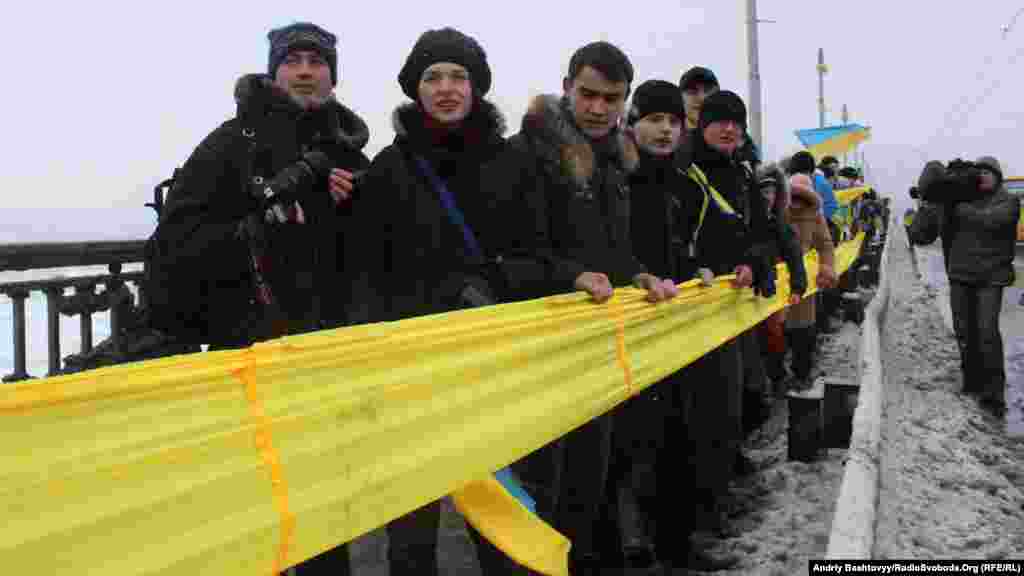 До Дня Соборності на мосту Патона у Києві громадські активісти з'єднали береги Дніпра символічним «ланцюгом єдності».