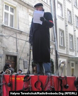 Львів – Сьогодні у Львові у день народження відомого письменника Леопольда фон Захер-Мазоха близько півсотні львів’ян підтримали іншого письменника Юрія Винничука. Вони провели флеш-моб під гаслом «Red go porno» на знак протесту щодо скарги до Генпрокуратури депутата від Компартії України Леоніда Грача. Парламентар вважає один із віршів Юрія Винничука порнографічним і таким, що закликає до насильницького повалення чинної влади.