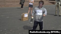 Близько півсотні людей прийшли у вівторок зранку, щоб висловити владі свою позицію на захист української мови. Акцію насправді можна назвати флеш-мобом, тому що молодь розіграла справжнє театралізоване дійство. Активісти в масках Януковича, Ківалова та Колесніченка спочатку вішали локшину на вуха інших учасників зібрання. Врешті-решт їм це набридло, і вони досить обережно, але показово почали кидати в несправжніх депутатів та президента старим взуттям.