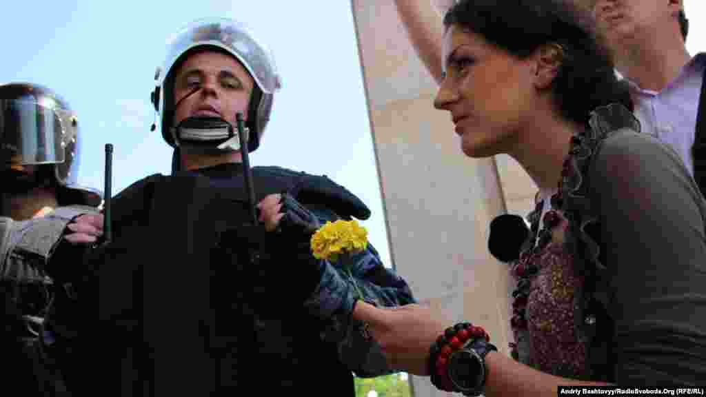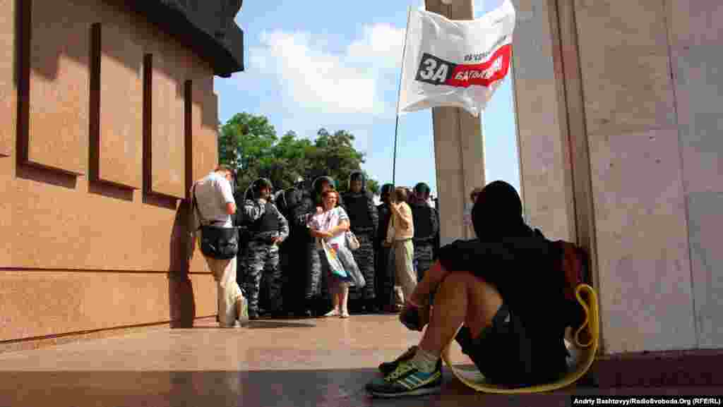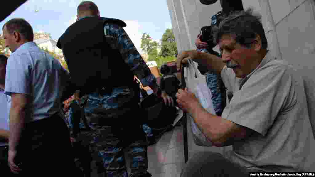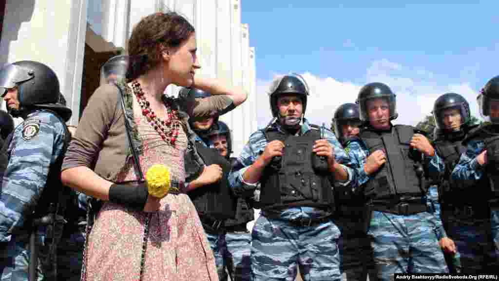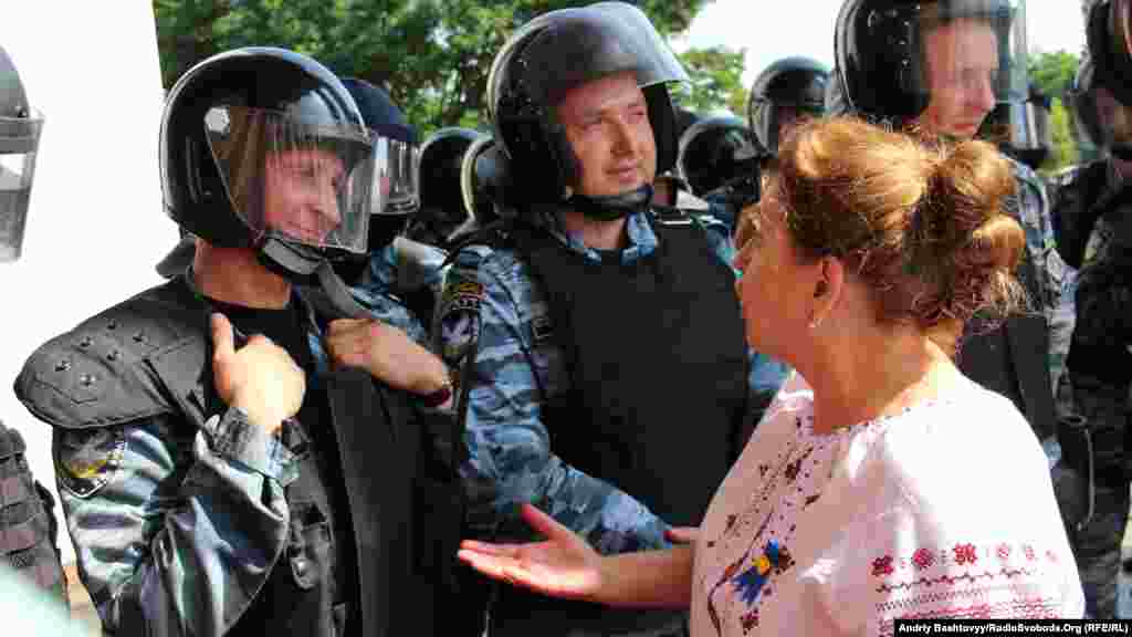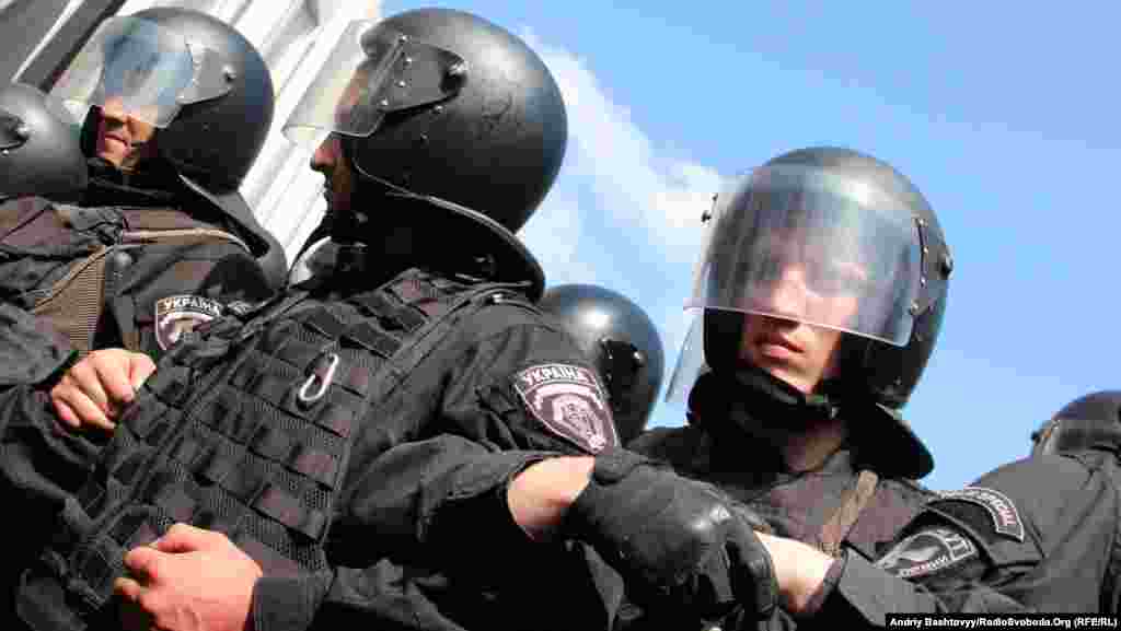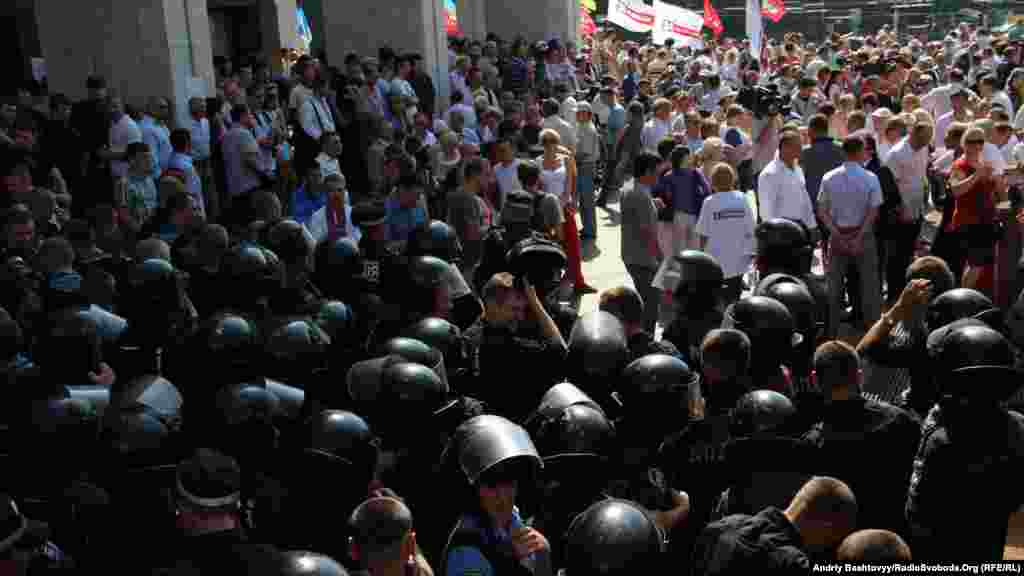 Бійці спецпідрозділу «Беркут» відтіснили народних депутатів та тих, хто протестує проти ухвалення мовного закону, від службового входу Українського дому.