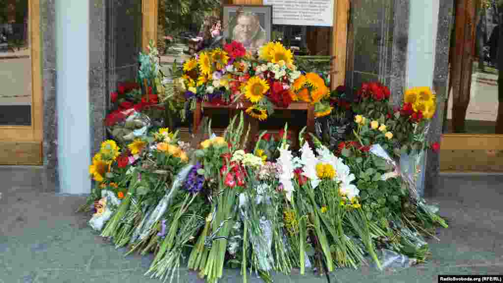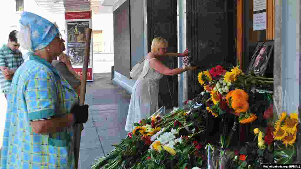 Біля Національного академічного драматичного театру імені Івана Франка жителі Києва запалюють свічки та покладають квіти, щоб вшанувати пам'ять Богдана Ступки.