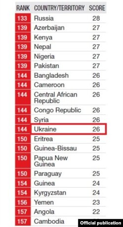 Україна ж має нині індекс сприйняття корупції 26. Вона зайняла 144–149-е місця разом із Бангладеш, Камеруном, Республікою Конго, Сирією і Центрально-Африканською Республікою.
