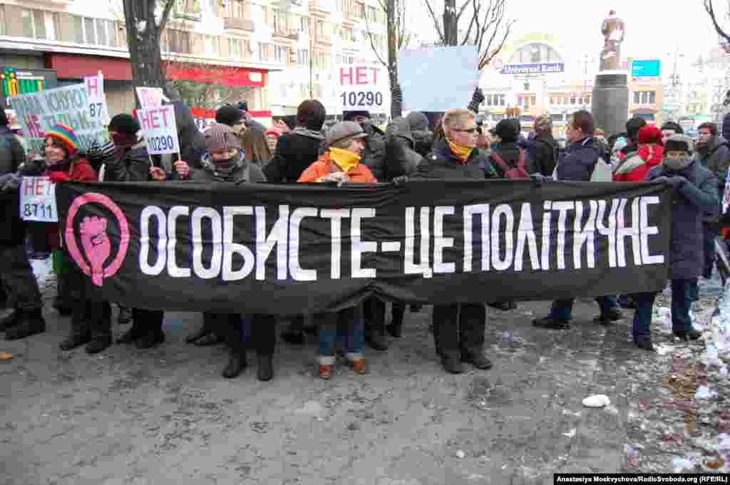 У центрі Києва відбулася акція проти законодавчих ініціатив щодо заборони пропаганди гомосексуалізму та щодо мирних зібрань. Учасники мітингу вважають, що так в Україні хочуть обмежити права людини.