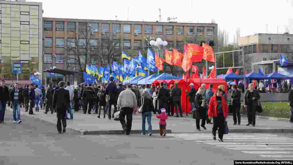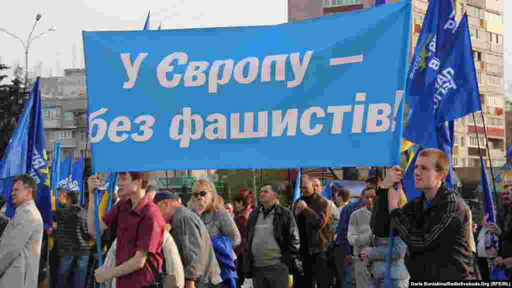 На Соборній площі, де спершу мав відбуватися опозиційний мітинг, черкаська обласна влада організувала «антифашистський мітинг» – концерт «патріотичної» пісні. Кілька десятків черкащан стояли із прапорами Комуністичної партії, Партії регіонів та з блакитними плакатами із підписами Партії регіонів: «У Європу без фашистів», «Ні фашизму в Україні», «Пишаємося Великою перемогою над фашизмом». Причому «фашистами» ті, хто виступав зі сцени, називали нинішніх опозиціонерів, зокрема, ВО «Свобода».
