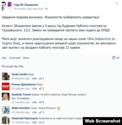 «Оля (Сніцарчук – ред.) крім того, що журналістка, вона чиясь сестра, дружина. Точно так само дружина, діти є і у того ж прем’єра, і у Захарченка, і у кожного. Дуже показовою була реакція прем’єр-міністра: йому навіть не сподобалось прочитати ці написи. Чисто по-людськи я його не розумію за цей вчинок», – дивується кореспондент агенції «ЛІГАБізнесІнформ» Наталія Тарасовська.