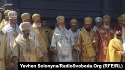 Хода завершилася опівдні молебнем на Володимирській гірці, який очолив патріарх Київський Філарет. У промові він тричі згадав про українську владу, повідомляє кореспондент Радіо Свобода.