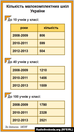 В Україні, за даними Міністерства освіти та науки, понад 4,5 тисячі малокомплектних шкіл, із них початкових – де навчається менше ніж 10 учнів – понад півтисячі. Міністерство освіти вважає, що ці школи треба закрити, а дітей возити на навчання до великих, добре оснащених шкіл. Експерти кажуть, що цього року така доля спіткала 161 школу.