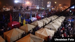 На Європейській площі встановлені два десятки наметів з партійною символікою опозиційних сил, і цієї ночі там грілися ті, хто не захищав у цей час огороджений металевими парканами периметр наметового містечка.
