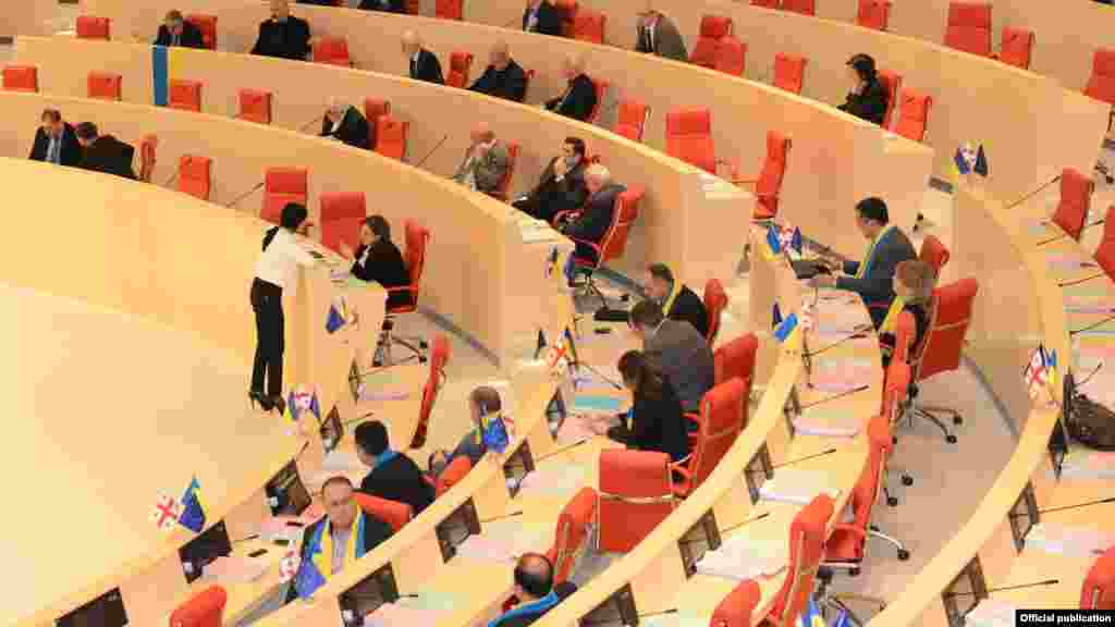 У парламенті Грузії сьогодні вивісили державні прапори України. Із цими прапорцями і шаликами в синьо-жовтих кольорах прийшли на засідання депутати від опозиції. Голова парламенту Давіт Усупашвілі попросив їх знайти і для нього прапорець України, який він встановив разом із прапорами Грузії і ЄС на своєму робочому місці.