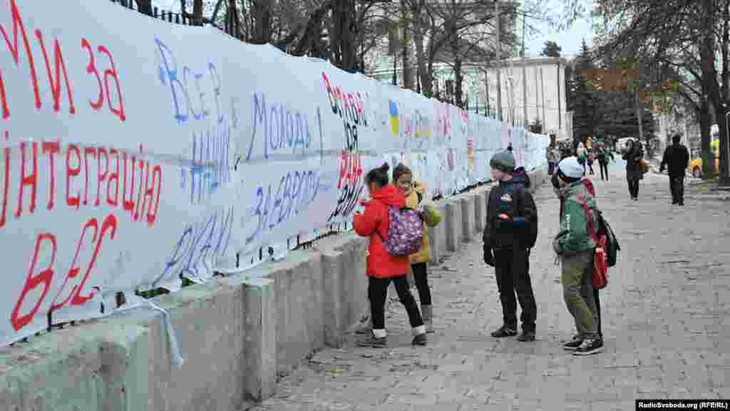 12-річна Оксана Паляниця пише «ЄС – це наше мабйтнє» на полотні біля Львівської Політехніки