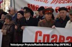 «Геть бандерівську самостійність!» – близько сотні активістів низки проросійських організацій прийшли під стіни кримського парламенту, щоб заявити, що 19 лютого – 60-та річниця рішення про передачу Криму до складу України – не святковий для них день.