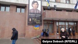Наразі на приміщенні міської ради розгорнутий великий банер з портретом загиблого студента і словами «Вічна пам’ять Герою!», горять запалені свічки.