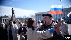 «Ми йдемо додому! Крим – у Росію! Вітаю вас усіх!» – кадри зі святкування у Сімферополі – з феєрверками, російськими прапорами і співанням гімну сусідньої держави – в основі сюжетів російського телебачення про «референдум» у Криму. Основний акцент – на «безпрецедентній явці»: російські засоби інформації повторюють про 83 відсотки і розповідають, нібито на деяких виборчих дільницях охочі проголосувати займали чергу з 6-ї ранку.