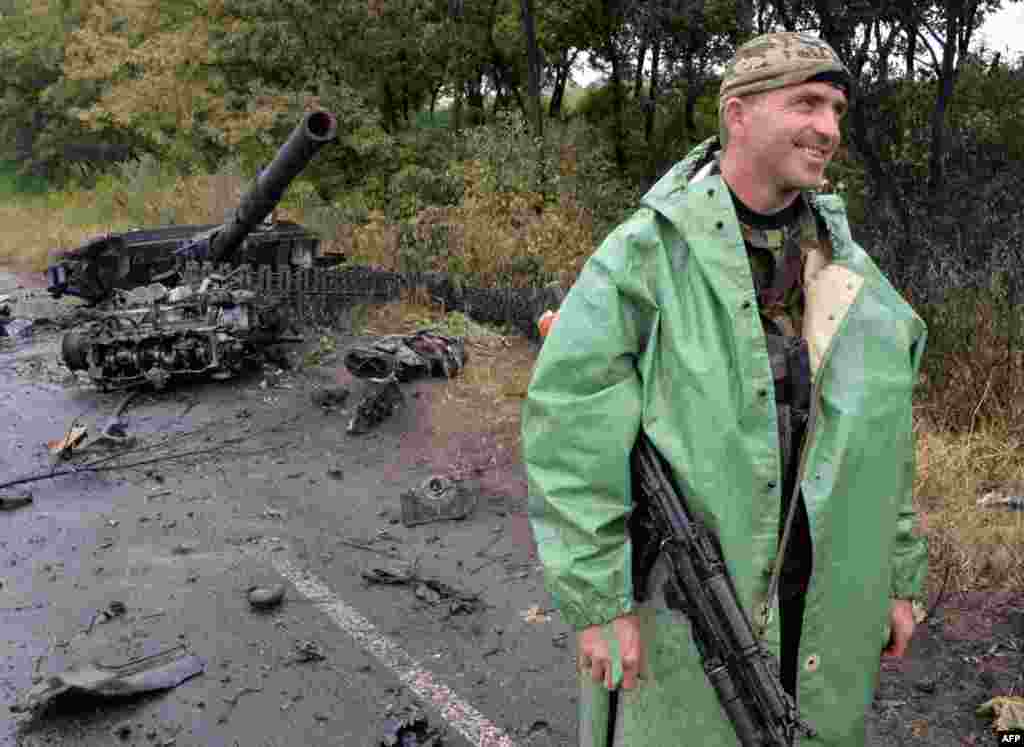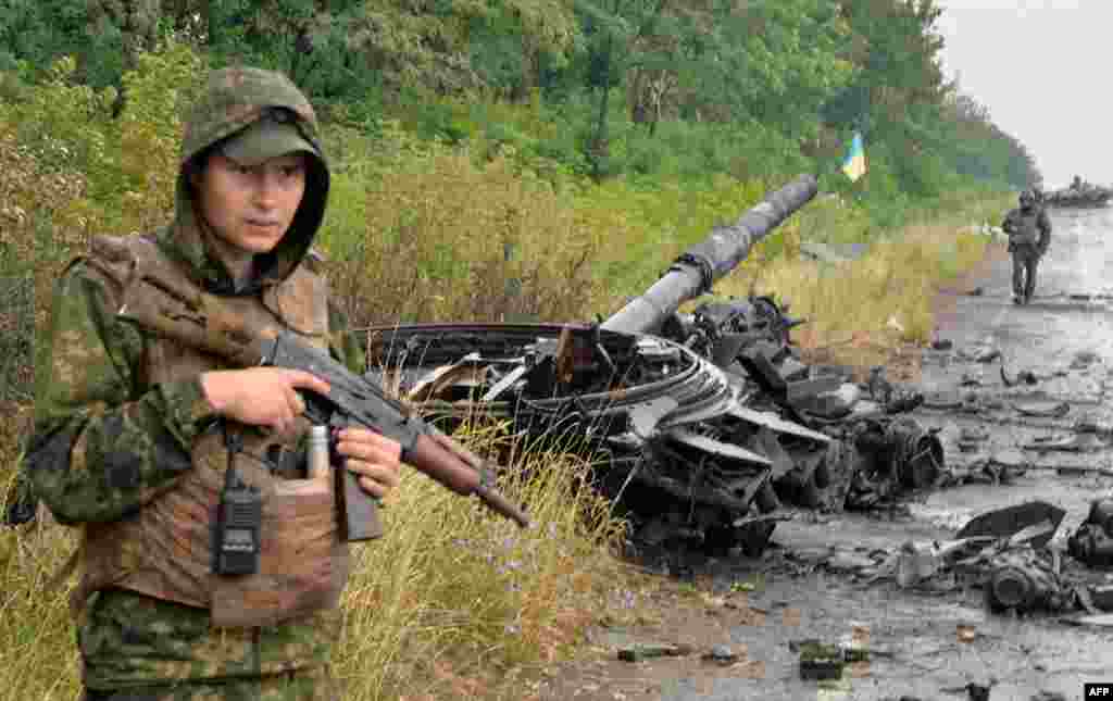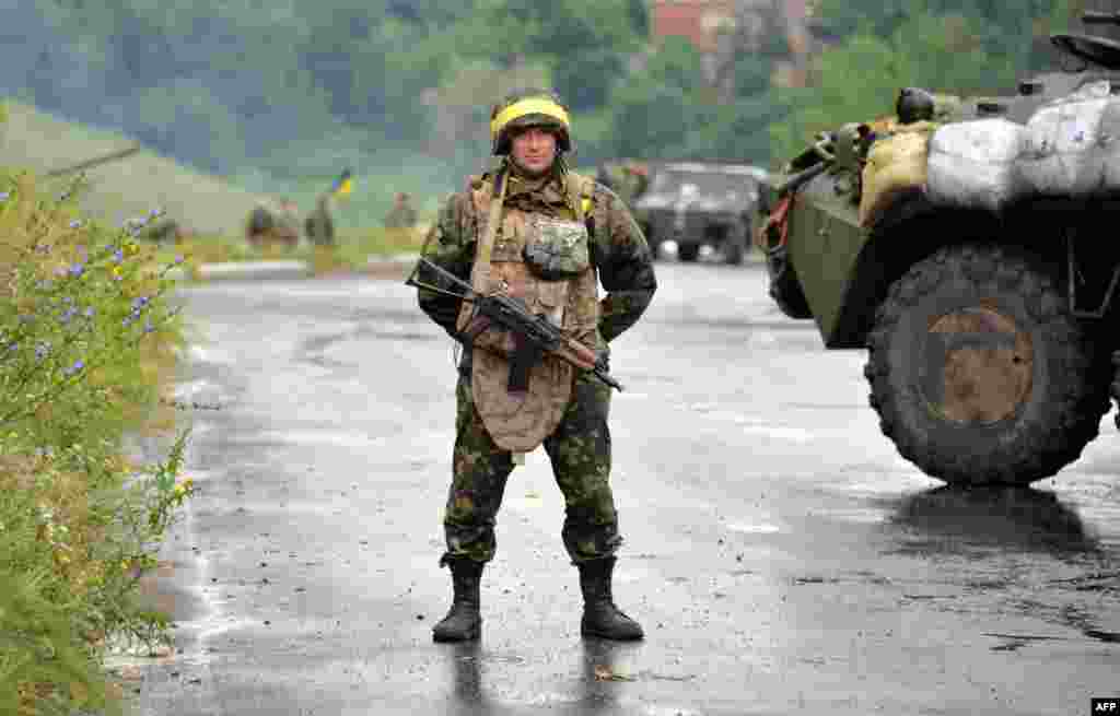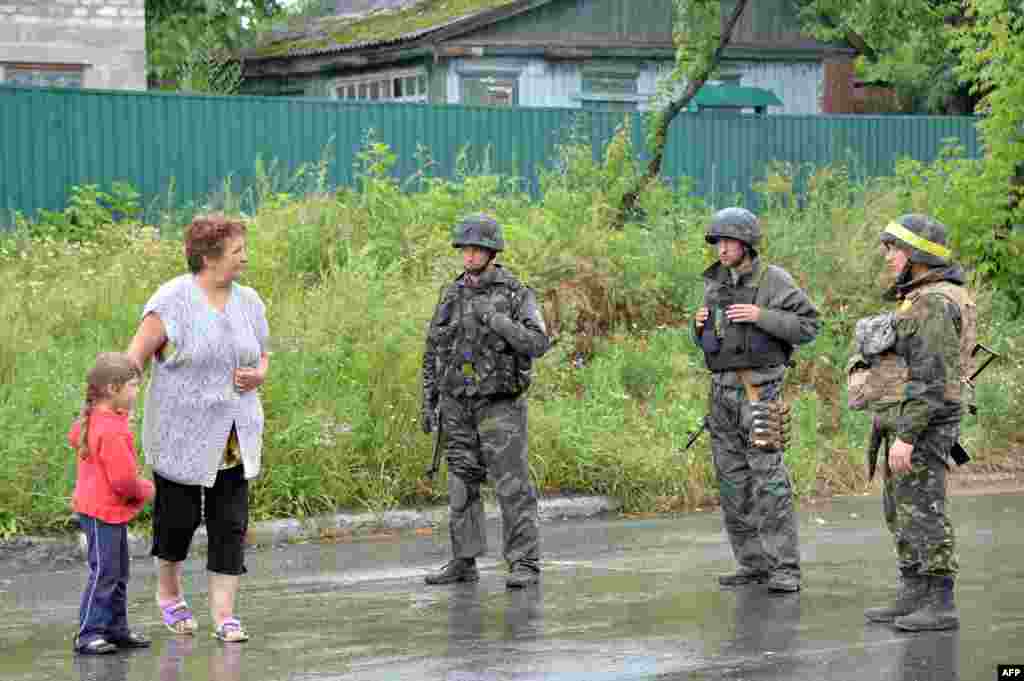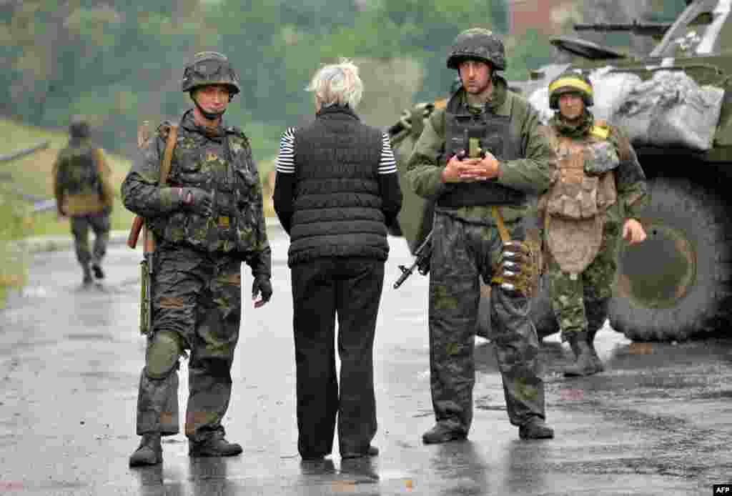 Місцеві жителі спілкуються з українськими військовими на дорозі зі Слов'янська в Краматорськ, де напередодні відбувся бій з проросійськими бойовиками.
