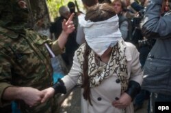 Привезли мене до будівлі СБУ. Вийшла я з машини, там проходив житель міста Слов’янська, повний чоловік зі злісним поглядом, і запитав: «Кого ви привезли?» Вони кажуть: «Це з жіночої сотні». Він почав стрибати біля машини, кричати на все місто: «Я тебе, суку, буду особисто, коли тебе відпустять, топити в річці і різати». Ті, що мене привезли, намагалися його заспокоїти: «Іди далі, не кричи на все місто». Довели мене до підвалу і кажуть: «Голову». Я не зрозуміла, що вони хочуть з моєю головою. Знову кричать: «Голову». Той, що біля підвалу, тримає якусь ганчірку і каже: «Голову, сука, нахилила». Нахилила я голову, він обмотав її ганчіркою, а зверху скотчем – червоним, по-моєму. Потім завели мене в підвал, можна сказати, пролітала кожні чотири сходинки, бо взяли за шкірку. Зібралося біля мене, як я чула по голосах, напевно, чоловік сім, почали обзивати, що «ти майданута, ви палили «Беркут», ти попалася, все, ти вже не жилець». І так, напевно, години дві обзивали.