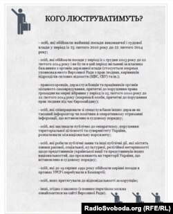 Під перевірку, згідно з законом, потрапляють всі найвищі державні посадовці, держслужбовці і службовці органів місцевого самоврядування (за винятком виборних посад). Відповідно до положень документа, гарантована люстрація поширюється на осіб, які обіймали найвищі посади в органах виконавчої і судової влади за президентства Віктора Януковича, а також ті, хто був членом Компартії за часів СРСР.