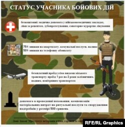 Артур Дерев’янко, відповідаючи на запитання Радіо Свобода, розповів, що, крім цього, учасники бойових дій можуть розраховувати на низку пільг.