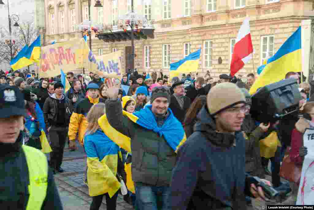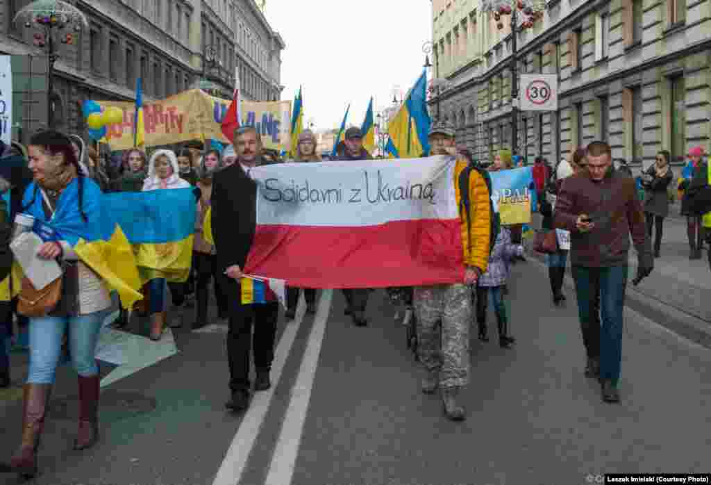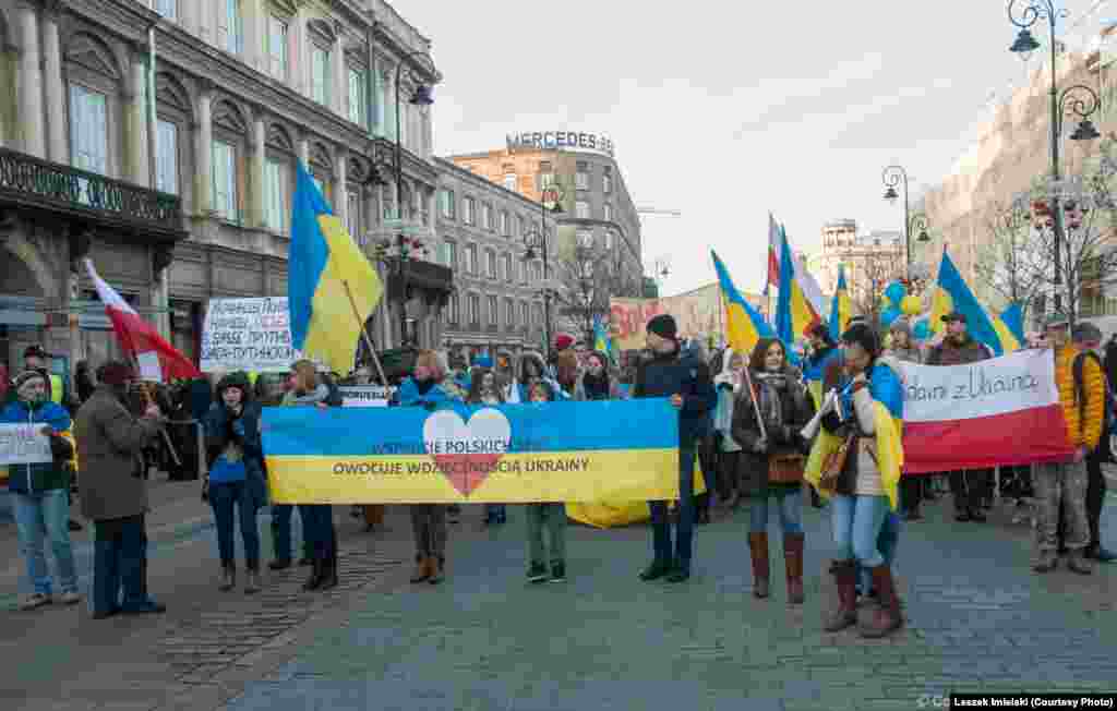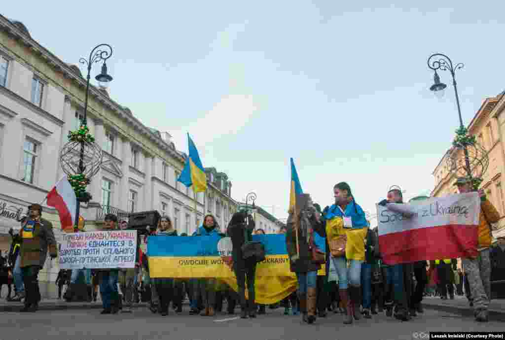 Кілька сотень учасників пройшлися центром столиці Польщі, щоб висловити підтримку українцям та віддати шану загиблим біля дошки пам’яті під посольством України у Варшаві. (Фото надані фундацією «Відкритий діалог»)