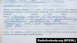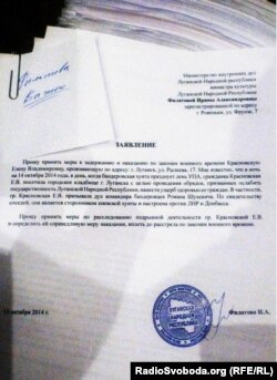 «Прошу вжити заходів до затримання і покарання за законами воєнного часу Красновської Олени Володимирівни, яка живе за адресою: м Луганськ, вул. Рилєєва, 17. Мені відомо, що в ніч на 14 жовтня 2014 року, коли бандерівська хунта святкує день УПА, громадянка Красновська О.В. відвідала міське кладовище м. Луганська з метою проведення обрядів, покликаних послабити державність Луганської Народної Республіки, завдати шкоди здоров’ю її громадян. Зокрема Красновська О.В. викликала дух командира бандерівців Романа Шухевича. За свідченням сусідів, вона є прихильником київської хунти і налаштована проти ЛНР і Донбасу. Прошу вжити заходів з розслідування підривної діяльності Красновської О.В. і визначити їй справедливу міру покарання, аж до розстрілу за законами воєнного часу», – мовиться у заяві.