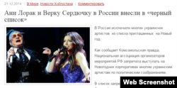 «НАОЗ підготувала рейтинг зірок, які потрапили під табу. Список очолили Ані Лорак, Світлана Лобода, Андрій Данилко (Вєрка Сердючка), Іван Дорн та Анастасія Приходько, всі вони родом із України. Якщо в минулі роки попит на артистів, які походять із України, був високим, то цього року запити на них від великих компаній навіть не надходять», – кажуть в НАОЗ.